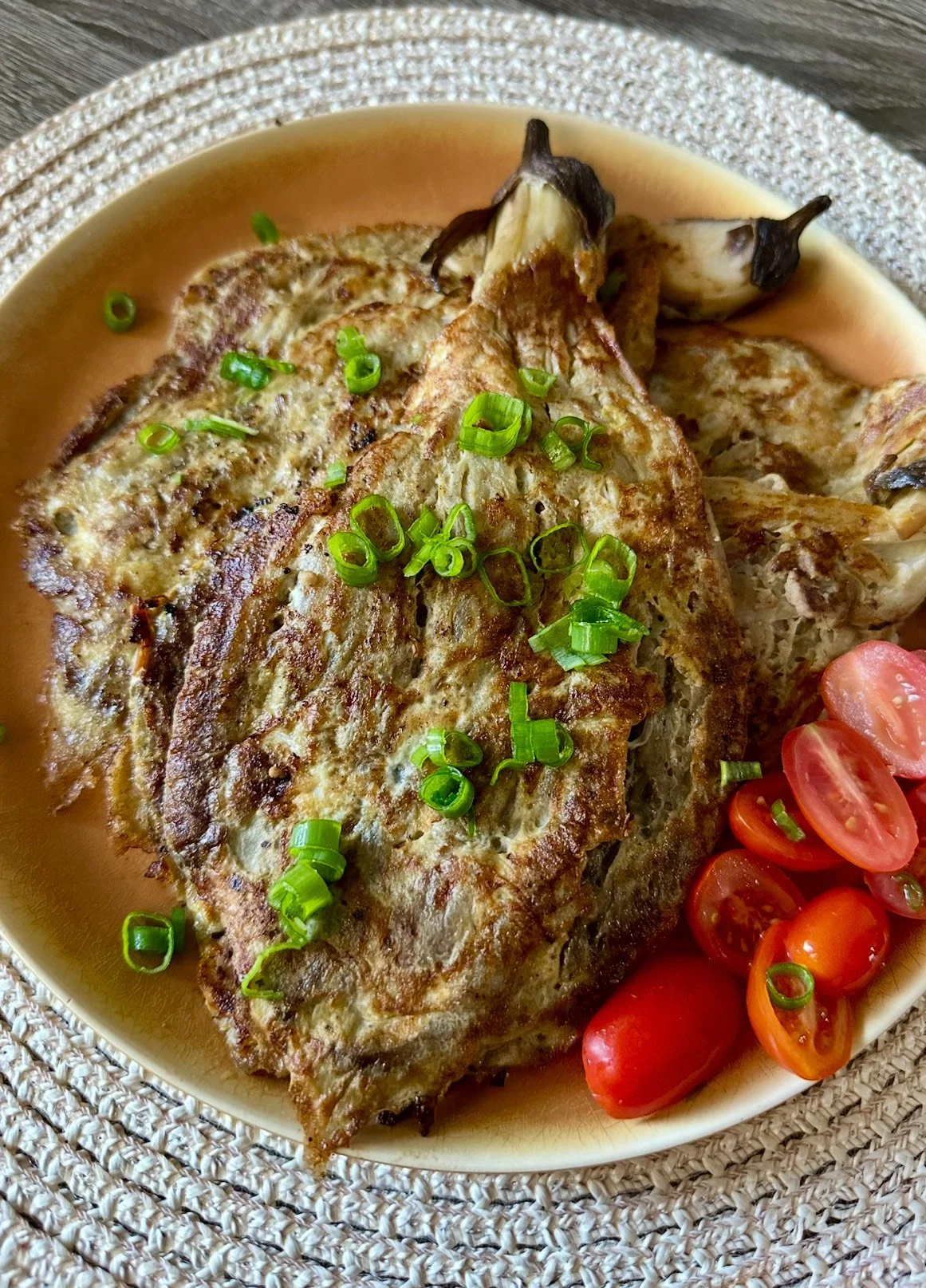 4. Fry in 2 tbsp oil over medium heat. Cook 3-4 minutes per side. I spoon pork mixture onto eggplant as it cooks. Serve with a side of garlic rice and your choice of toppings.