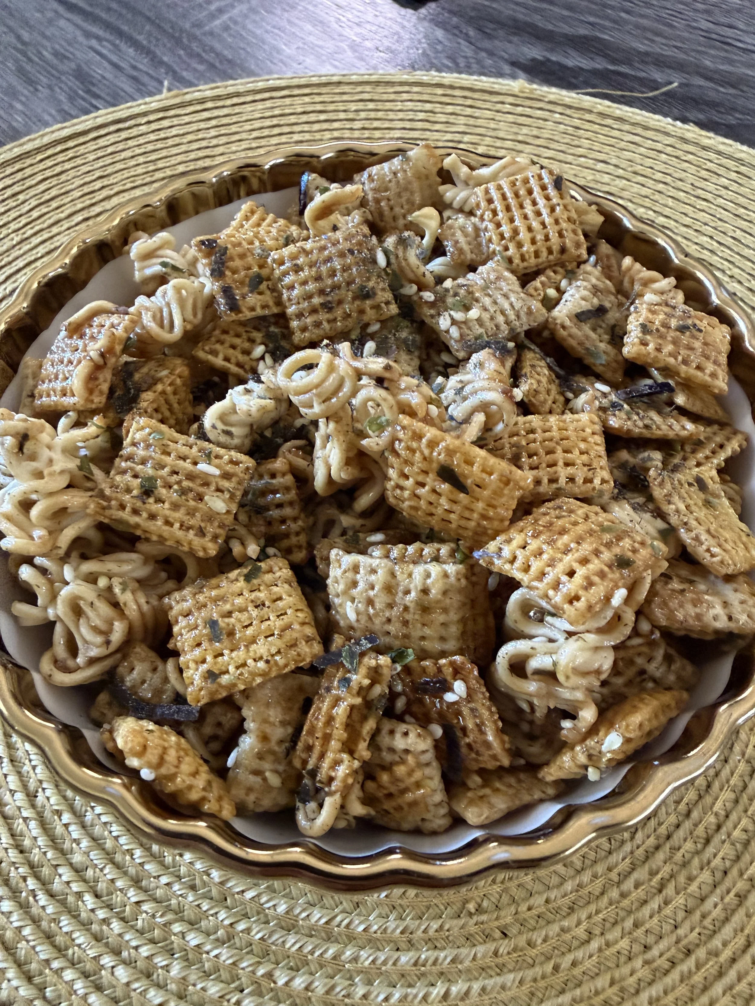 Think rice-cracker party mix meets ramen. This snack is all crunch + umami: uncooked ramen noodles broken into pieces, tossed with Chex, then baked with a sweet-savory butter glaze and finished with furikake. Perfect for road trips, holiday snack jars, or movie nights.