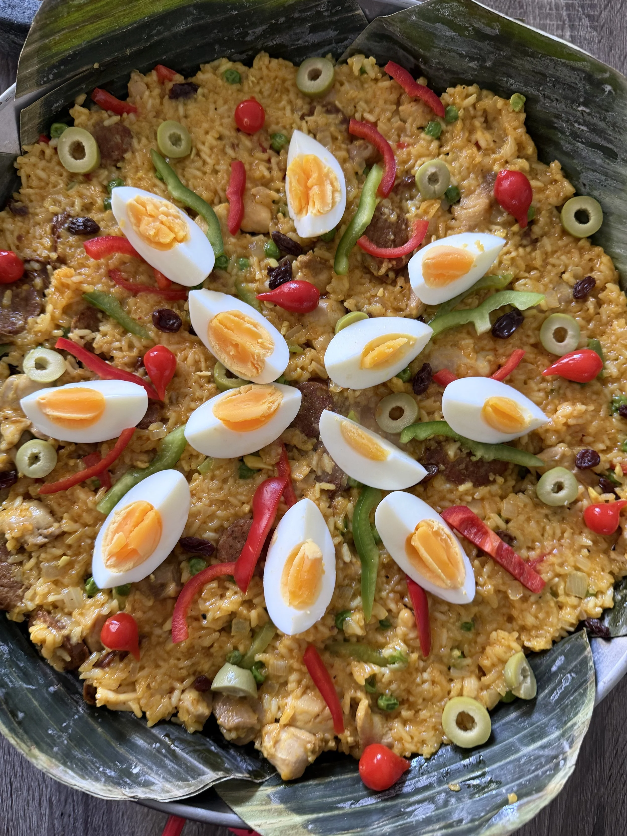 I transfered my Arroz Valenciana to a paella pan lined with banana leaves for presentation points
