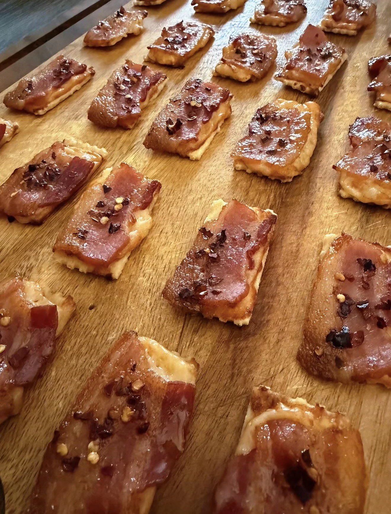 3. Assemble each cracker by placing one slice of Parmesan on the SkyFlakes cracker, topping with a piece of bacon, sprinkling with brown sugar, and finishing with red pepper flakes. Repeat with remaining crackers.