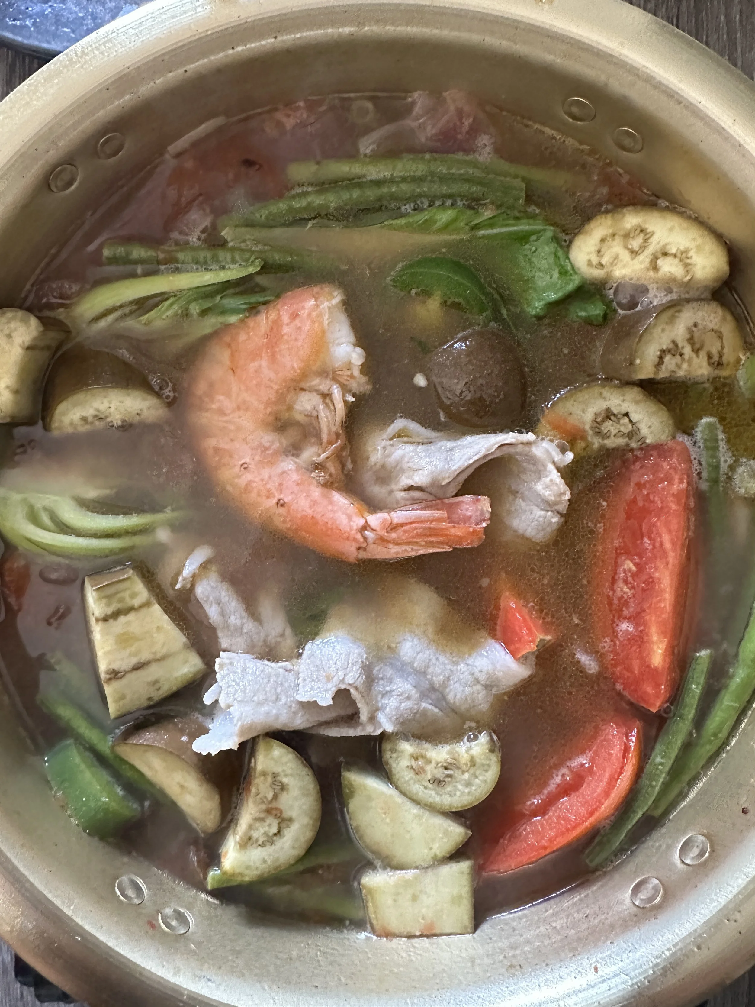 This recipe is incredibly flexible. It works great with beef, pork, shrimp, tofu, or mushrooms. For this version, I used a combination of thin sliced pork belly and jumbo shrimp, which cook quickly and soak up the sour broth beautifully. You can scale this down for a smaller meal or lay everything out and let the whole family cook at the table.